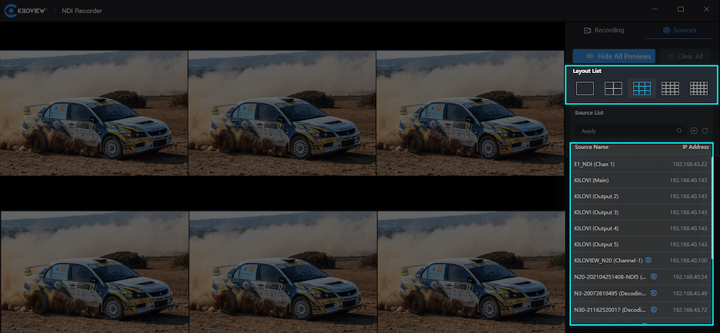 Kiloview lieferte erstmals im 2020 eine NDI-Software mit dem MultiView Player, einer Multi-Screen-Wiedergabesoftware, die bis zu 16 Streams in einem einzigen Multi-View-Fenster-Layout darstellen kann. Zu den Anzeigeoptionen für den Benutzer gehören die geteilte Anzeige auf mehreren Bildschirmen, Bild-in-Bild (PIP) oder die Wiedergabe in mehreren Fenstern. Die Software ermöglicht eine Verbindung mit Smartphones, Computern, NDI-fähigen Encodern, Kameras und Produktionssystemen.