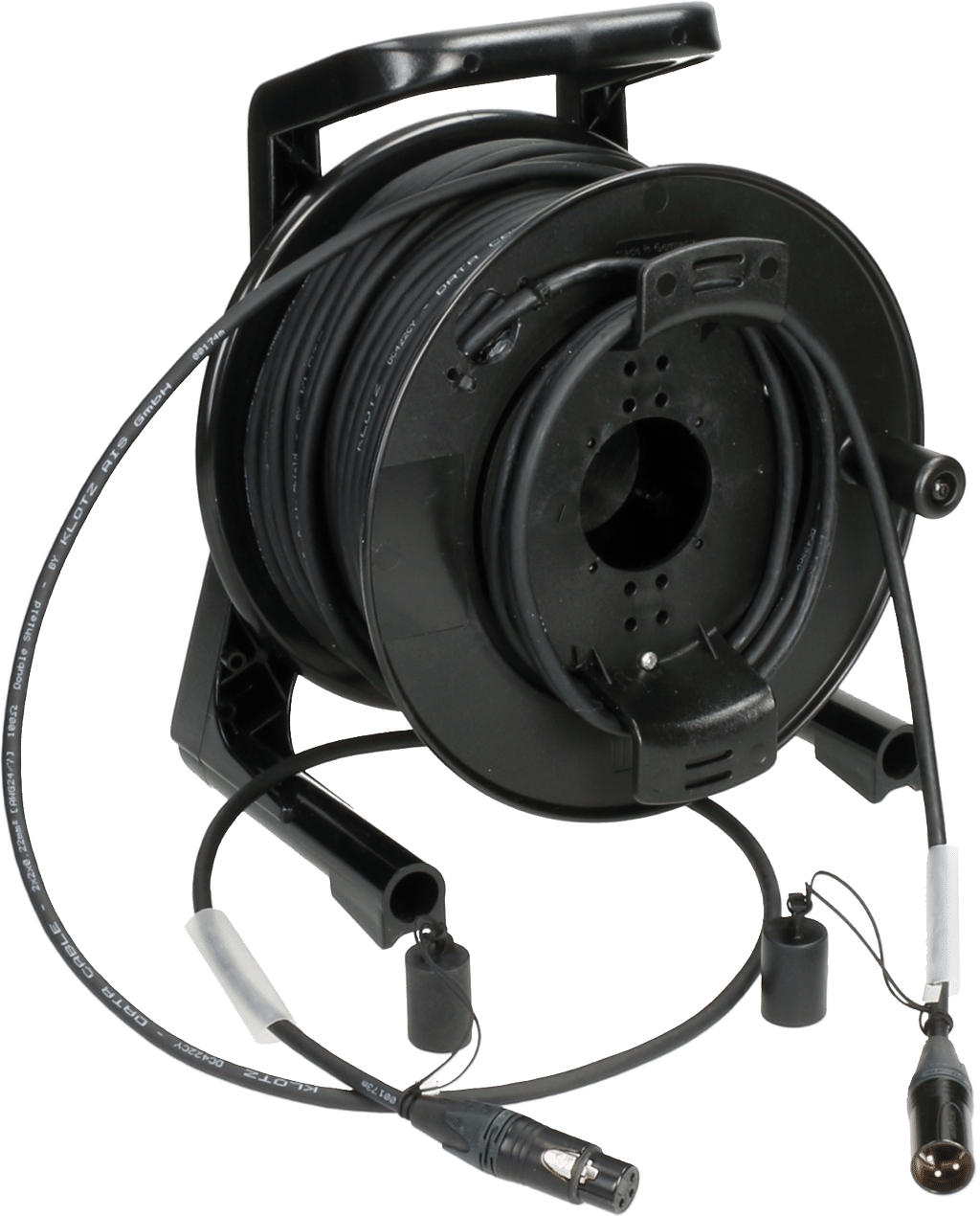 Die Kabeltrommel besteht aus bruchfestem Kunststoff und ist mit einer Feststellbremse versehen. Das StarQuad Kabel ist mit schwarz verchromten XLR 3p. Steckern von Neutrik und XLR Schutzkappen bestückt. Am äußeren Wickelkern ist das XLR male Kabelende flexibel in einer Länge von 2 m verfügbar. Beide Kabelenden sind zudem mit transparenten Schrumpfschläuchen zur freien Beschriftung versehen.