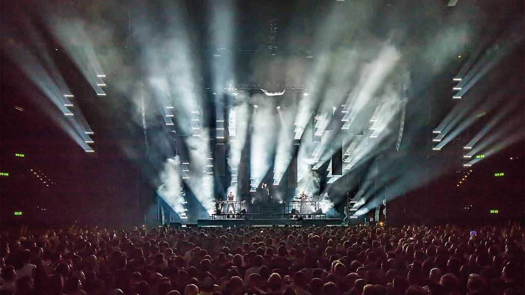 Seit über 10 Jahren setzen Jerry Appelt und Marc Brunkhardt immer wieder und in großen Stückzahlen Scheinwerfer von GLP ein – entsprechend groß war daher ihre Neugier auf die neuen KNV-Module. Für die aktuelle Scooter-Tour entstand nun aus insgesamt 14 KNV Cube ein Centereffekt über der Bühne der deutschen Techno-Urgesteine. Aus der Mitte des Sets heraus erstreckte sich der Effekt über die gesamte Bühne. „Zwischen den einzelnen KNV-Würfeln gab es Freiräume, so dass wir die gesamte Bühne damit überspannt haben“, erläutert Brunkhardt die Konstruktion. „Die Effekte, die wir aus diesem Cluster abfeuern konnten, waren schlicht umwerfend“, schwärmt er.