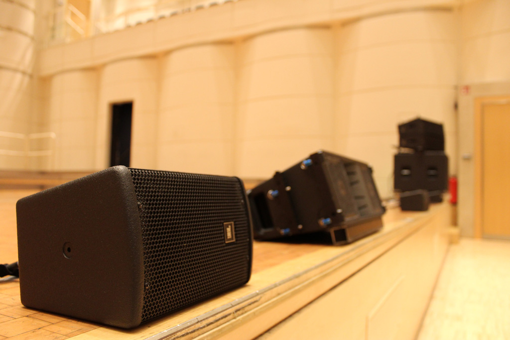 Die rückwärtigen Sitzplätze über der Bühne, die auch der Chor nutzt, werden mit 2 Stück JBL AM7212 Systemen versorgt. Für die obersten, am weitesten entfernten Plätze stehe 3 Stück JBL VRX932LA Systeme als zusätzliche Delay-Line zur Verfügung. Darbietungen in Stereo können durch 2 mobile Groundstacks mit JBL VTX B18 Subwoofern und weiteren VTX A8 ergänzt werden. Der Antrieb aller Lautsprecher erfolgt mittels 10 Crown I-Tech HD Endstufen, die im Netzwerk über verschiedene Medien gesteuert und/oder kontrolliert werden können. Alle Endstufen erhalten digitale AES Signale, die vom Soundcraft Vi5000 Mischpult erzeugt werden.