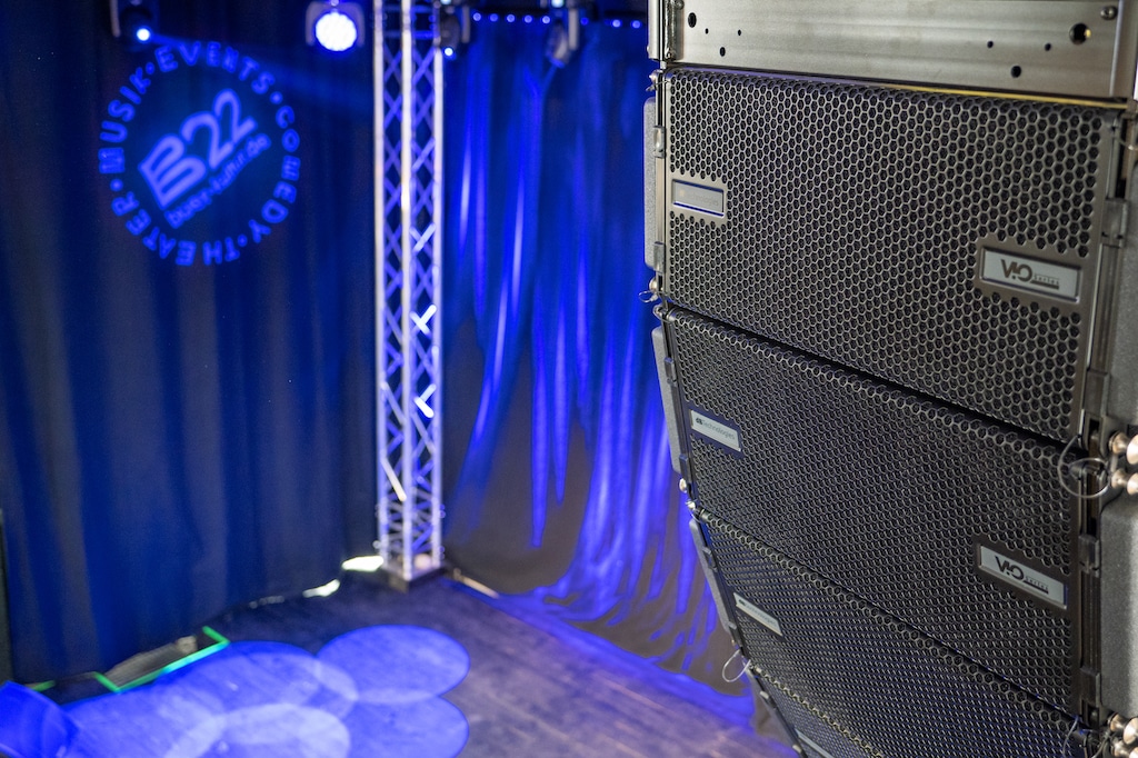 Im Club B22 installierte Schönweitz jeweils 5× VIO L208 Einheiten als Main Hang rechts und links der Bühne in die Truss. Unter der Bühne sind vier VIO S118R Subwoofer installiert. Für perfekten Monitor-Sound auf der Bühne für die musikalischen Acts sorgen fünf FMX 12 Wedges. Michael Weymann von Buer-Kultur ergänzt, „Perfect Sound hat uns sehr bei dem Projekt und der Installation der Beschallungsanlage geholfen – das war in allen Bereichen sehr professionell und positiv.“