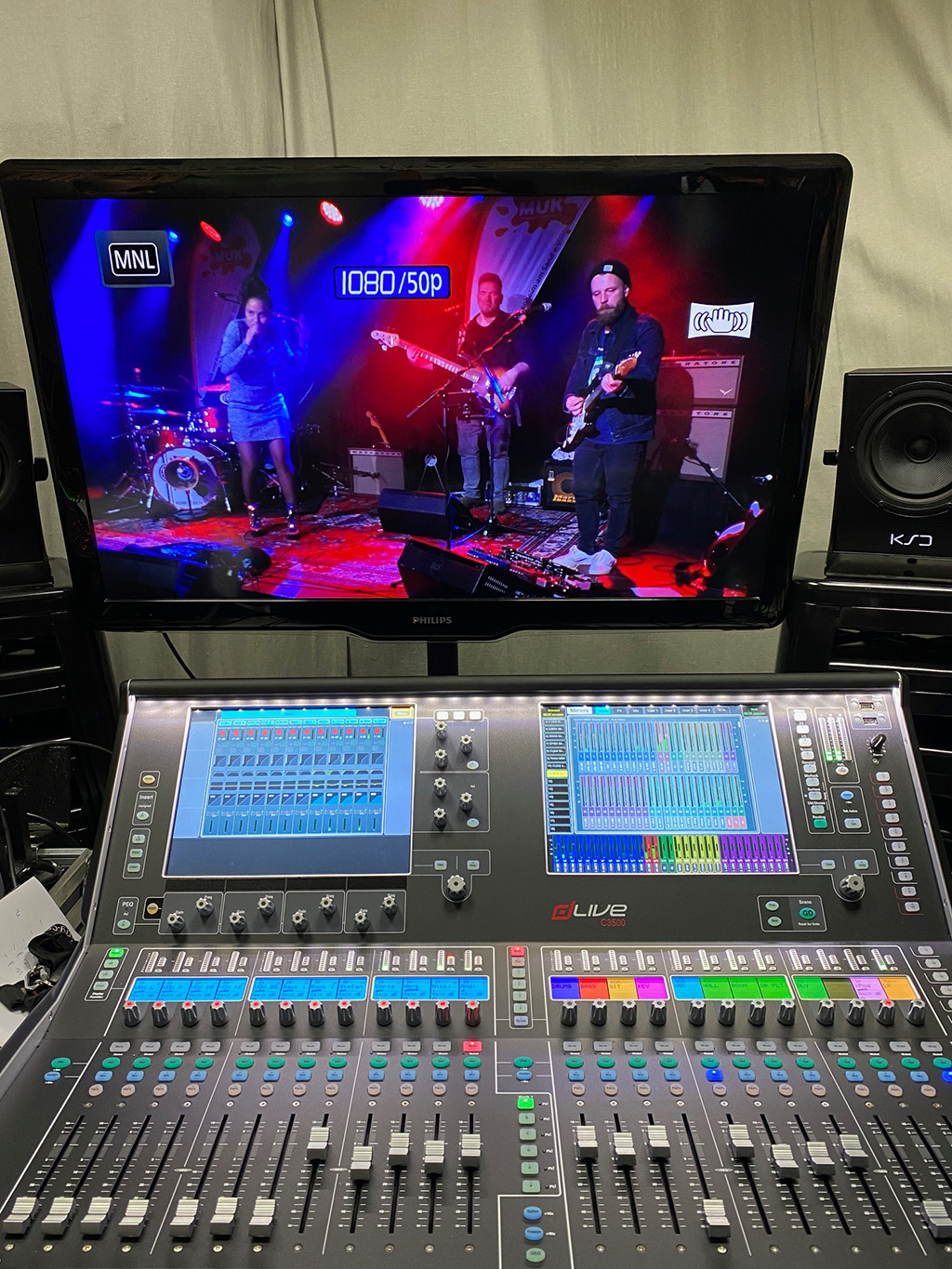 Die Streaming-Regie befindet sich aktuell in den Garderoben des Gleis4. Dort ist das C3500 Surface aufgebaut und über Studiomonitore kann der Audio-Mix für den Stream abgehört werden. Das CDM 48 Mixrack steht auf der Bühne und verwaltet die Ein- und Ausgänge. Sollte die Krisenlage es zulassen, wird das C-Class Surface aber wieder in den Saal umziehen und als FOH-Konsole für Live-Veranstaltungen genutzt.