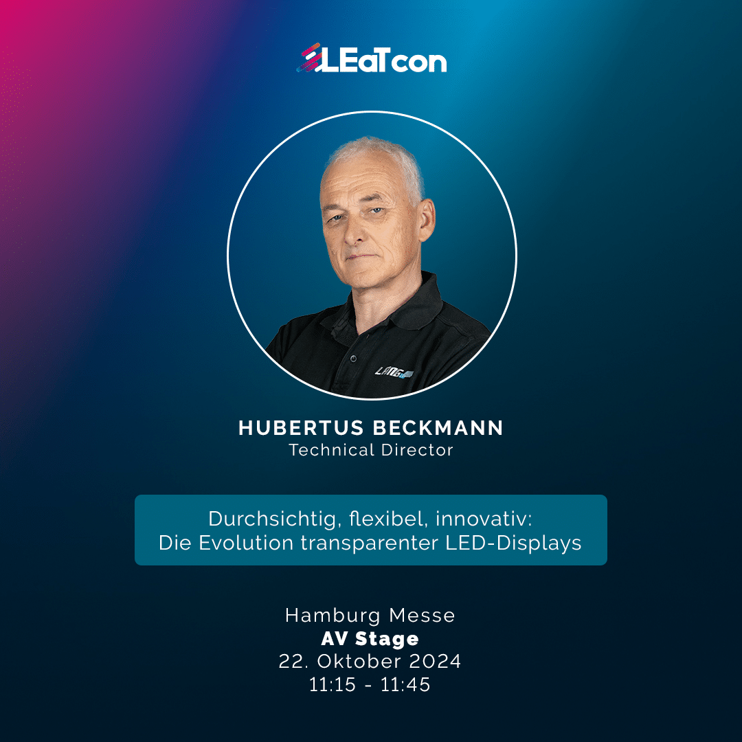 22.10.2024: 11:15 – 11:45 Hubertus Beckmann (Technical Director) „Durchsichtig, flexibel, innovativ: Die Evolution transparenter LED-Displays“ AV Stage