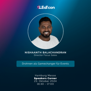 23.10.2024: 16:30 – 17:00 Nishaanth Balachandran (Director Focus Sales) “Drohnen als Gamechanger für Events“ Speakers Corner