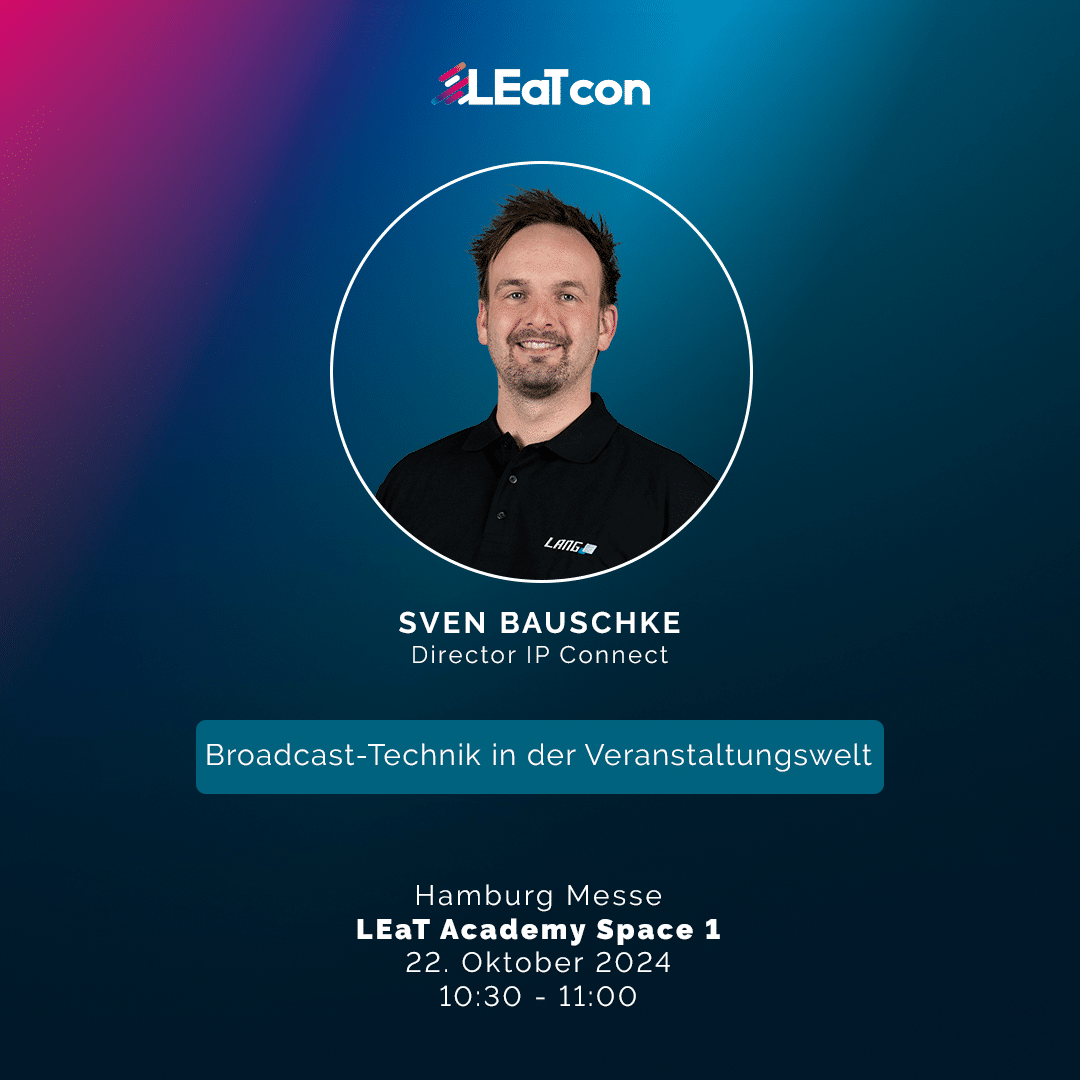 22.10.2024: 10:30 – 11:00 Sven Bauschke (Director IP Connect) “Broadcast-Technik in der Veranstaltungswelt“ LEaT Academy Space 1