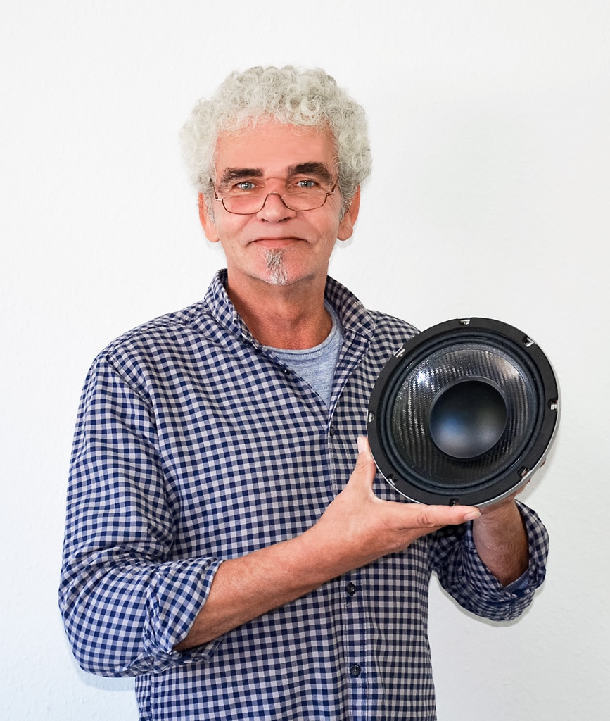 Jürgen Eicker, wie man ihn in Erinnerung hält – hier im Jahr 2017 mit einem neuen 8″-Lautsprecher mit Carbon-Membran für eine Line- Array-Neuentwicklung (Bild: Craaft Audio)