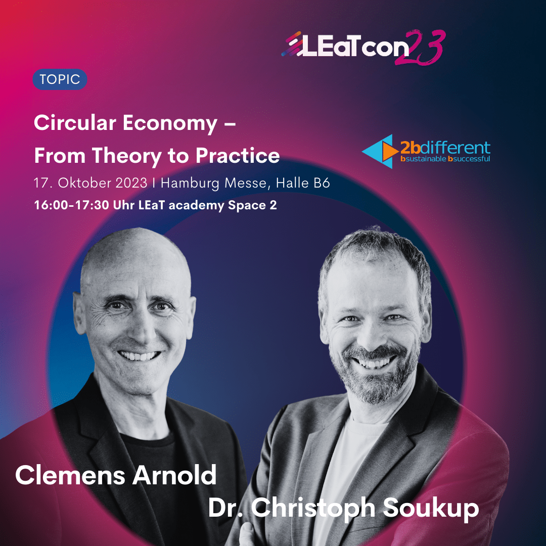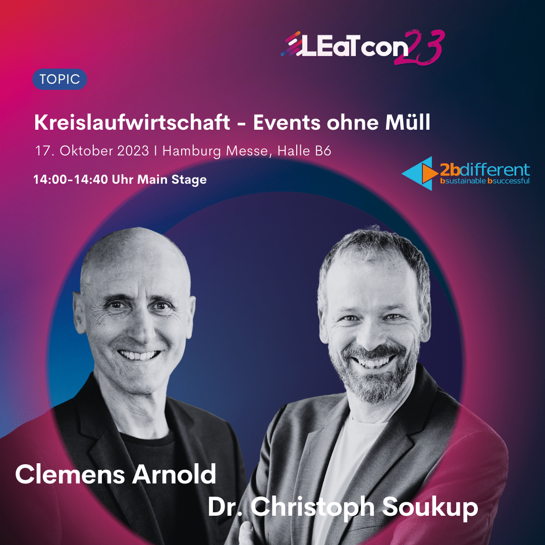 Die Eventbranche ist bekannt für ihre Schnelllebigkeit und den hohen Einsatz von Ressourcen. 2bdifferent-Geschäftsführer Clemens Arnold und Dr. Christoph Soukup, Leiter bei Steinbeiss Beratungszentrum Circular Economy und Partner bei 2bdifferent, beleuchten unter dem Titel „Kreislaufwirtschaft – Events ohne Müll“ von 14:00 bis 14:40 Uhr die Kreislaufwirtschaft als wichtigen Schritt zur Bewältigung globaler Herausforderungen wie Klimawandel, Verlust der biologischen Vielfalt, Abfall und Umweltverschmutzung – sie betrachten Notwendigkeiten, Herausforderungen und Chancen.