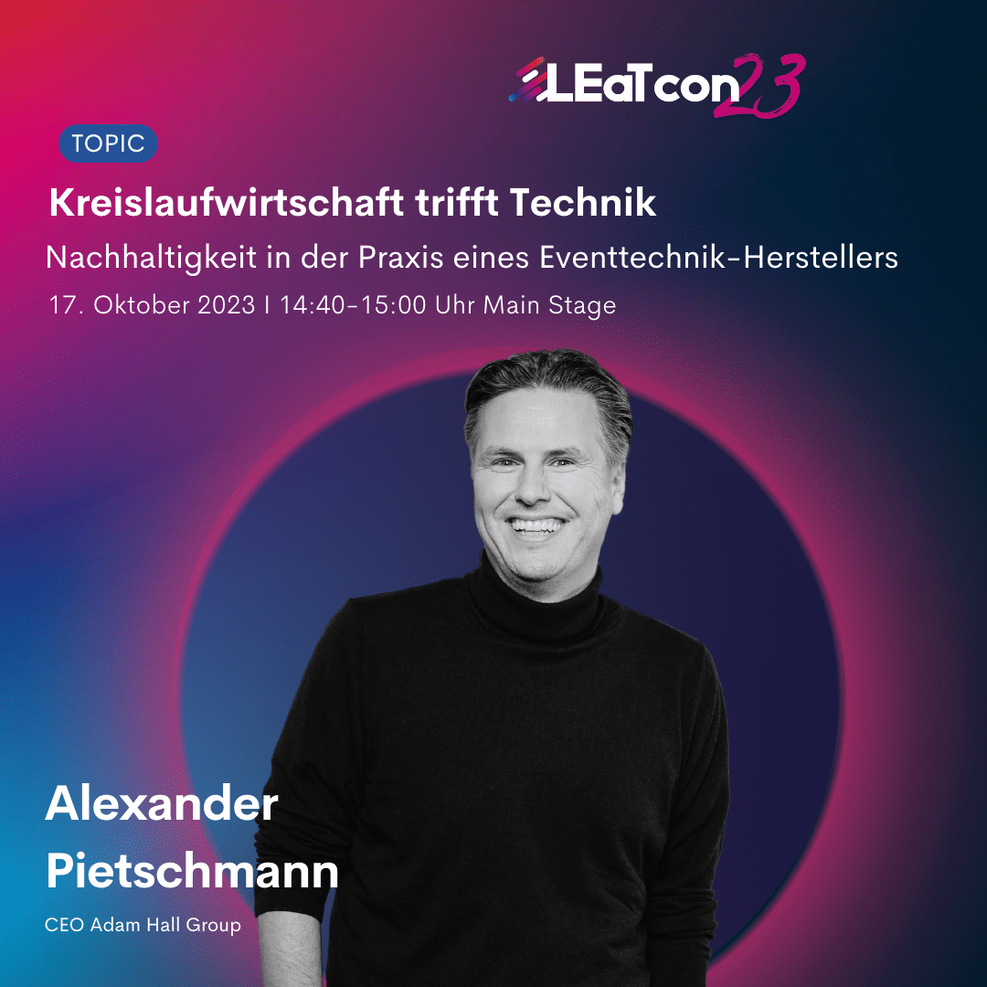 Anschließend diskutieren die 2bdifferent-Experten im Talk mit Alexander Pietschmann, Geschäftsführer bei dem Eventtechnik-Hersteller Adam Hall, wie die Eventtechnik-Branche nachhaltige und ressourcenschonende Produktionen umsetzen kann. Unter dem Motto „Kreislaufwirtschaft trifft Technik“ gibt Pietschmann wertvolle Einblicke in die Praxis seines Unternehmens, das versucht, den eigenen CO2-Fußabdruck zu messen und ressourcenschonende Maßnahmen zu ergreifen. Seid gespannt auf seine Insights und Learnings.
