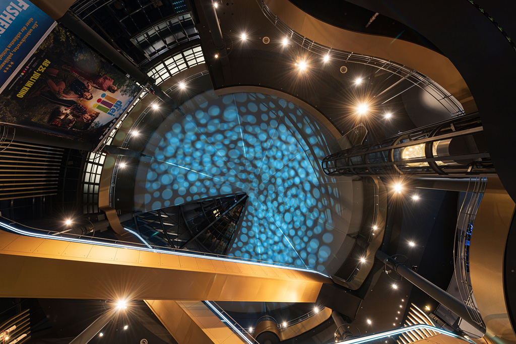 Sie konnten auch den zweiten Bereich – den zentralen Kuppelbereich des Hauptatriums – mit den gleichen Leuchten abdecken und so den gesamten Raum in eine völlig andere Umgebung für Partys, besondere Veranstaltungen, Präsentationen und andere Zeiten, in denen das Atrium als Veranstaltungsraum genutzt wird, verwandeln.