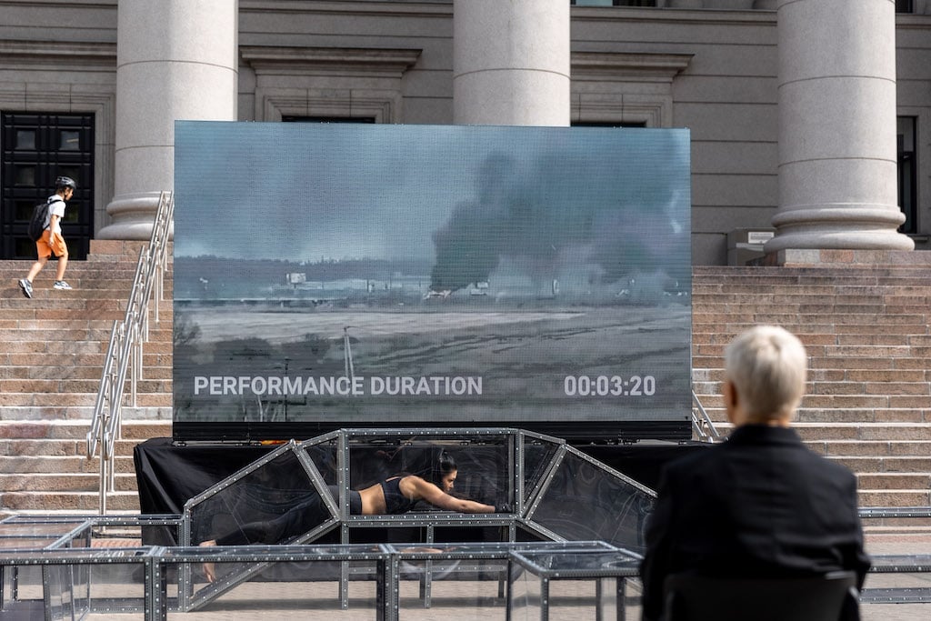Ein gläsernes Labyrinth, in dem eine um ihre Existenz kämpfende Person eingeschlossen ist, sollte eine globale Arena der Gegenwart darstellen, in der die ukrainische Nation zusammen mit allen zivilisierten Ländern dem Aggressor Widerstand leistet, der versucht, den Begriff des Menschseins zu vermindern und vernichten .