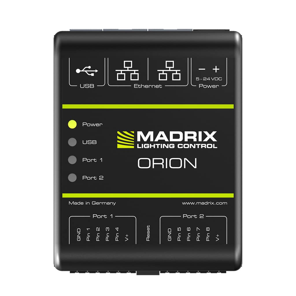 Orion heißt das neue Madrix-Hardware-Interface “Made in Germany”. Das neue Eingabegerät ermöglicht interaktive Projekte auf ganz einfache Weise: Acht Eingänge empfangen analoge Eingangssignale von 0 bis 12 V und stellen damit die Kompatibilität zu einer Vielzahl an Sensoren, Potis, Schaltern und Tastern her. Sensoren für Licht, Temperatur und Infrarot können genauso einfach in das nächste, interaktive Projekt integriert werden, wie die bekannten Standards zur Gebäude- und Heimautomation.