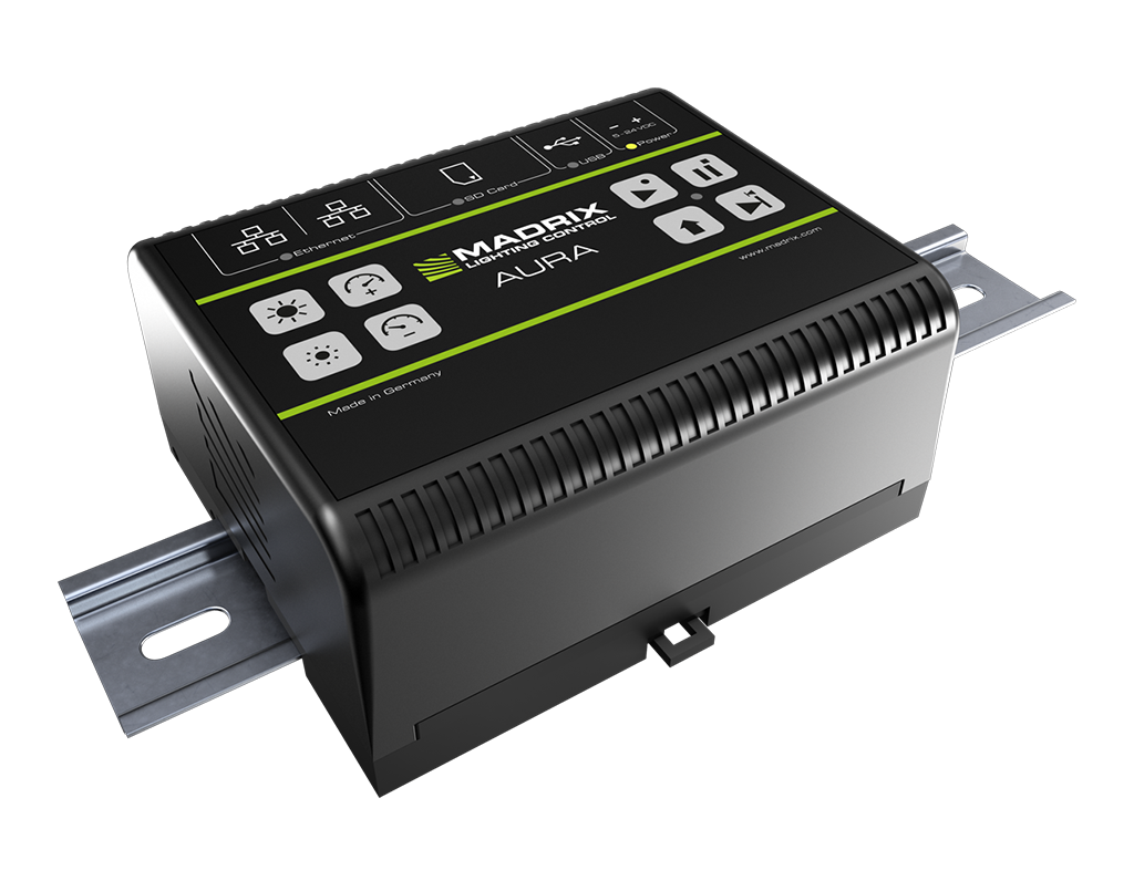 Madrix Aura kann dynamische Lichteffekte auf SD-Karte aufnehmen und von dieser wieder abspielen. Damit sollen Lichtshows mit faszinierenden Effekten für Verkaufsflächen, Lichtdecken, Medienfassaden, Freizeitparkattraktionen, Fitnessstudios, Eingangsbereiche, Bars und Restaurants und viele weitere Anwendungen noch einfacher möglich werden.