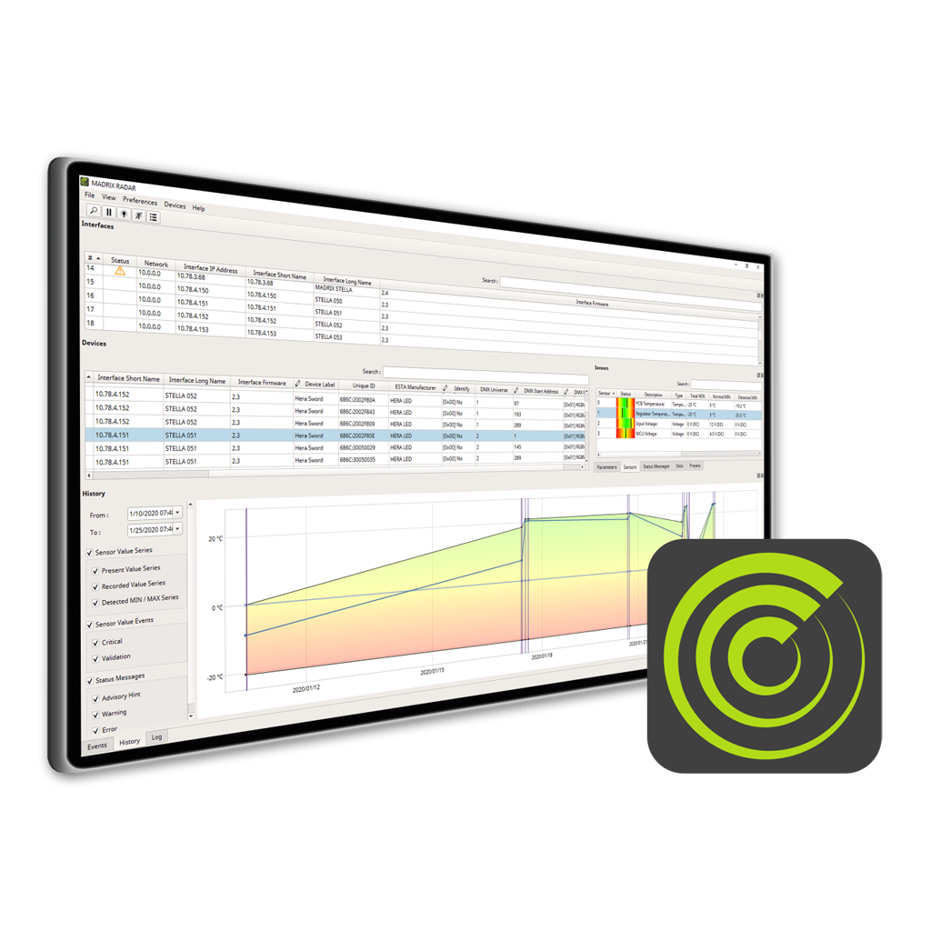 Madrix Radar vereinfache laut Pressemeldung die Konfiguration und Verwaltung von RDM-Geräten (Stichwort „Remote Device Management“). Es ermögliche auch eine dauerhafte Überwachung dieser Geräte im Live-Betrieb. Unabhängig davon, ob beispielsweise Lampen im Truss oder am Gebäude angebracht sind: Einstellungen, wie DMX-Startadresse oder DMX-Betriebsmodus, legt man aus der Ferne fest. Wichtige Informationen und Sensorwerte, wie Temperatur und anliegende Spannung, lässt man sich grafisch darstellen und kontinuierlich kontrollieren. Am Anfang letzten Jahres neu erscheinen, steht jetzt die erste große Aktualisierung bereit.