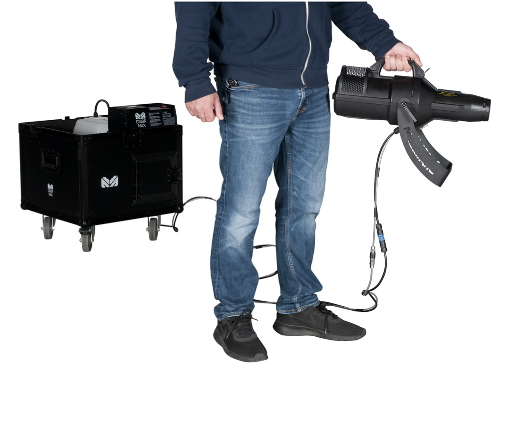 Crisp Max besitzt einen 20-Liter-Fluidtank und ist verbaut in einem touringtauglichen Flightcase mit robusten Rollen für den einfachen Transport. Der 10 m lange Schlauch der Maschine kann beispielsweise an Traversen befestigt und mit Hilfe der optional erhältlichen 10 Meter-Schläuche auf bis zu 50 m verlängert werden.