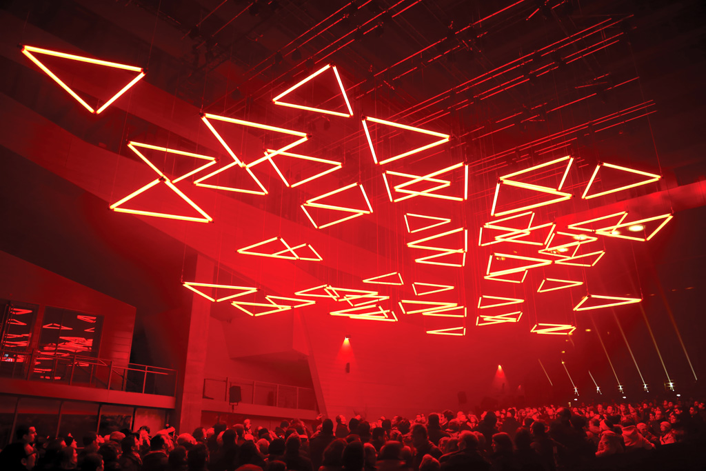 In Halle 2 steht Bonfire – eine fünf Meter hohe Lichtskulptur aus 162 LED-Leuchtkörpern mit über 20.000 einzeln steuerbaren Pixeln, die verstärkt durch knisternde Klänge wie ein digitales Lagerfeuer wirken.