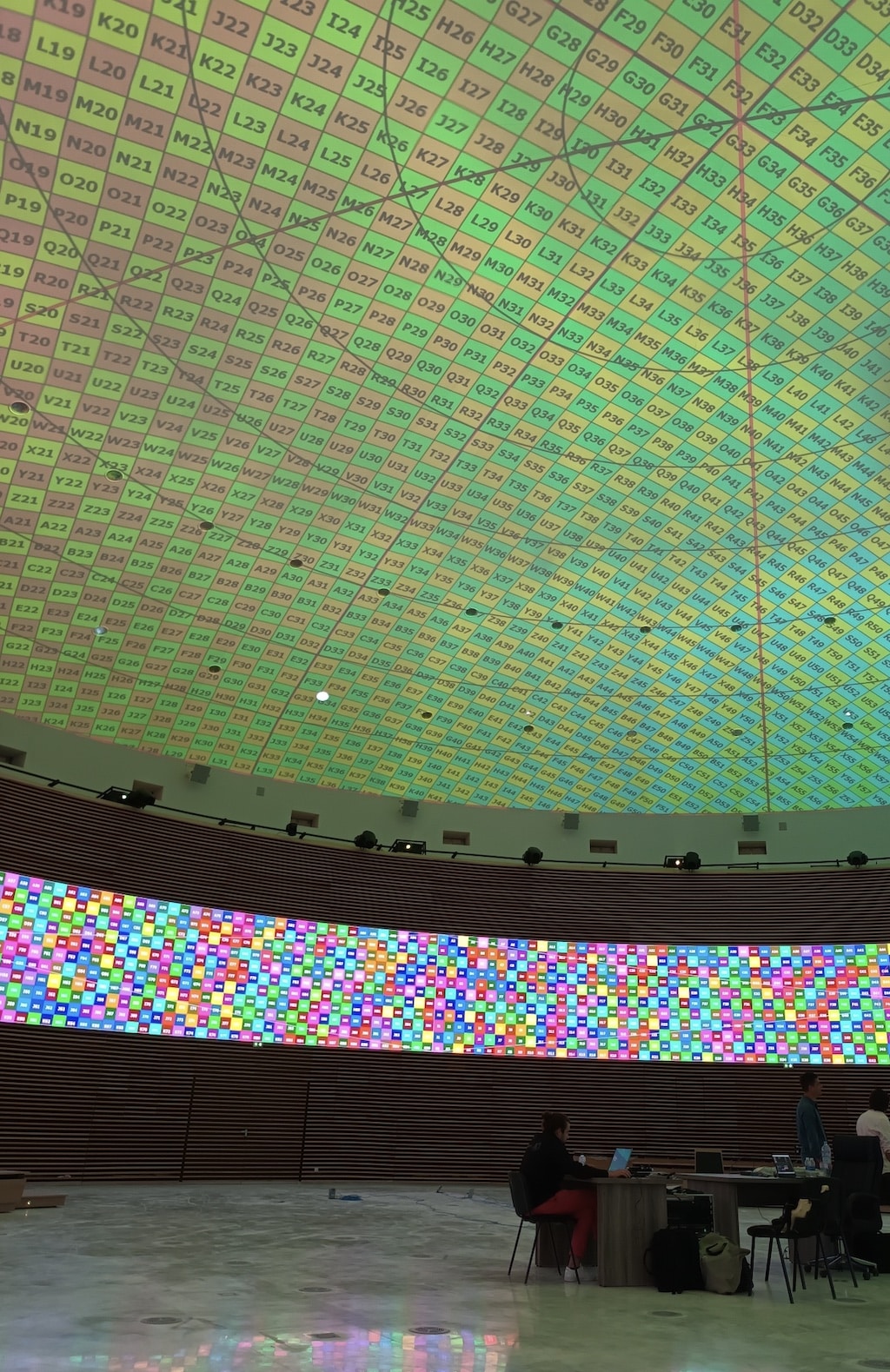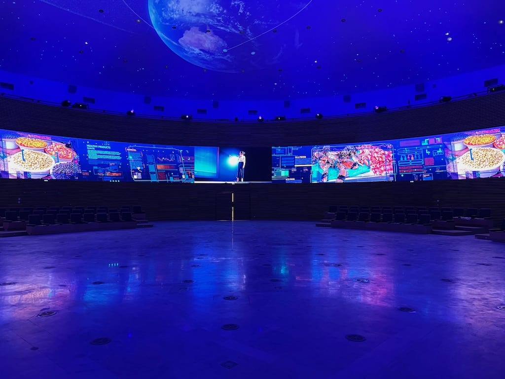 Die Agora hat die Form eines kreisförmigen Raums mit einem Durchmesser von 32 Metern. Im unteren Teil wurde eine zylindrische LED-Wand aus Samsung IFR25-Kacheln mit einem Abstand von 2,5 mm installiert. Der gebogene Bildschirm umschließt den Raum in einem Winkel von 311°, was einer Länge von +87 Metern und einer Höhe von 2,7 Metern entspricht.
