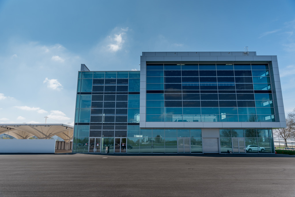 Und „nachhaltig“ heißt im Fall des Audi Brand Experience Centers „im umfassenden Sinne nachhaltig“: Mit Geothermie gespeiste Betonkerntemperierung sorgt für Wärme und Kühlung, die dreifach verglaste Fassade aus transparenten Photovoltaikelementen liefert den Strom und senkt die Kühllast. Die jährlich rund 42.000 Kilowattstunden versorgen das Gebäude selbst sowie sechs Ladesäulen, die Teil des E-Ladeparks der Audi AG am Münchner Flughafen sind, einem der größten Ladeparks in Europa.