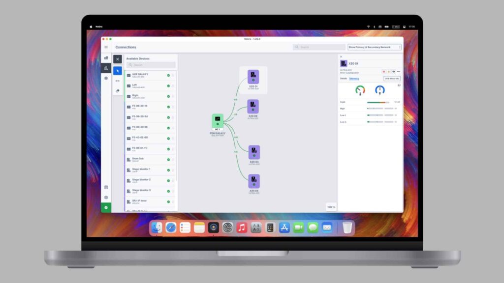 Die Verbindungstools von Nebra sind für die Konfiguration und Verbindung von Milan-zertifizierten Audiosystemen ausgelegt. „Viele aktuelle Audio-over-IP-Lösungen sind stark textbasiert“, sagt Andy Davies, Senior Product Manager bei Meyer Sound. „Indem wir die Verbindungen und das Monitoring in einem klaren visuellen Layout darstellen, ist die Systemübersicht viel einfacher zu verstehen. Verbindungen werden als grafische Linien dargestellt, die ein klares Bild des Systems abbilden, während Gerätesymbole ihre Farbe ändern, um potenzielle Fehlerquellen schnell zu identifizieren.“