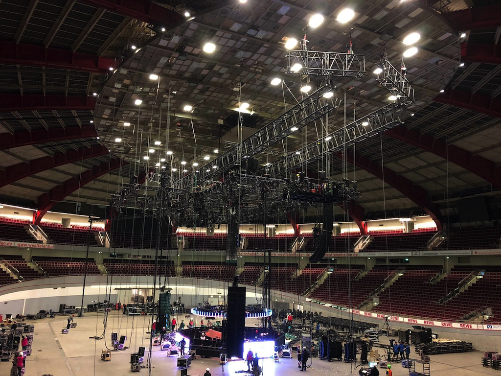 Problematisch wurde das Set Design der Tour für die Dortmunder Westfalenhalle: Das Dach der fast 60 Jahre alten Halle verfügt nicht über die erforderliche Tragfähigkeit, um das Equipment der Show tragen zu können. Deshalb wandte sich die Produktionsfirma Satis&Fy an die Firma Malecon, um eine akzeptable Lösung für das Rigging zu liefern. Malecon ist bekannt für seine Fähigkeiten im Schwerlast-Rigging und nahm die Herausforderung gerne an.