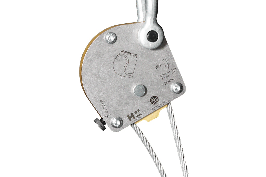 Mit dem Monobloq-System werde weniger Seilmaterial benötigt, und die Positionierung könne in Sekundenschnelle erfolgen. HOF bietet zwei verschiedene Monobloq-Versionen an: Eine für 8-mm-Stahlseile und eine für 10-mm-Stahlseile. Um mit jedem dieser Durchmesser zu arbeiten, muss der entsprechende Druckkeil verwendet werden. Der Einbau erfolgt in beiden Fällen auf die gleiche Weise: