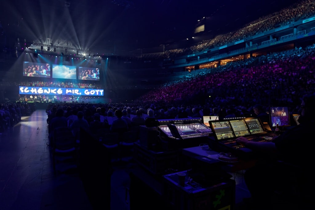 Dass Movinglights zum Einsatz kamen, war dem eng gesteckten Zeitrahmen geschuldet – es wäre schlichtweg unmöglich gewesen, eine Phalanx von Stufenlinsen einzeln nacheinander durch Techniker auf einem Steiger gezielt ausrichten zu lassen, zumal die Unterbrechung durch das Konzert von Bryan Adams zu berücksichtigen war. Um die Dimension zu verdeutlichen: Von insgesamt 196 Washlights hingen 110 Lampen oberhalb des Publikumsbereichs. Das Effektlicht lieferten 36 Robe Pointe Movinglights. „Für eine kirchliche Veranstaltung ist das schon etwas Außergewöhnliches“, kommentierte Lichtdesigner René Geißel die hohe Lampenzahl. „Immerhin sind wir hier nicht beim Eurovision Song Contest in Lissabon …“