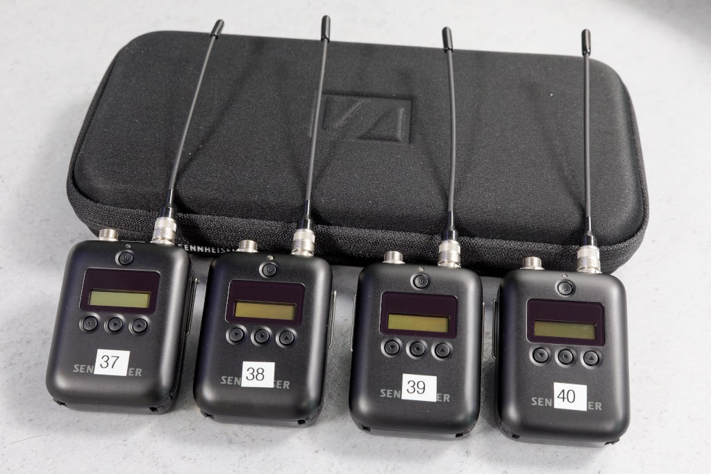 Das 19”-Rack mit den Empfängern sowie einem aktiven Antennensplitter ASA 3000 und einem Antenna-Combiner ACA 3 befindet sich nahe des Bühnenzugangs in der so genannten „Schleuse“. Hier werden die Protagonist:innen vor ihren Auftritten von einer Ton-Crew mit Hand- und Taschensendern ausgestattet, die wie in einer Art langgestrecktem Setzkasten mit nummerierten Fächern lagern.