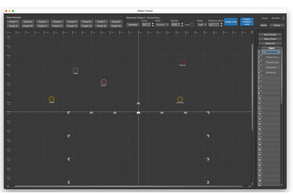 Mit dem Object Viewer können die Positionen von Klangobjekten in En-Snap überwacht und gesteuert werden. Der intuitive Workflow unterstütze die Positionierung und die Bearbeitung von Parametern für ein einzelnes Objekt oder ausgewählte Gruppen in absoluten und relativen Bearbeitungsmodi. Die Möglichkeit, die Sichtbarkeit von Objekten, Hintergrundbildern und Ansichtsabschnitten in benutzerdefinierten „View Presets“ zu organisieren, kombiniert mit Möglichkeiten, Objekte farblich zu kennzeichnen und Namen zuzuweisen, unterstütze die Individualisierung. Eingangsgruppen für die Auswahl mehrerer Objekte für die mulitple Bearbeitung und die Verknüpfung von Objekten mit mehreren Spiegelungsmodi für die Gruppenpositionierung sollen für mehr Effizienz innerhalb des Workflows des Object Viewer sorgen, der für die objektbasierte Erstellung von Inhalten bei immersiven Live-Anwendungen entwickelt wurde.