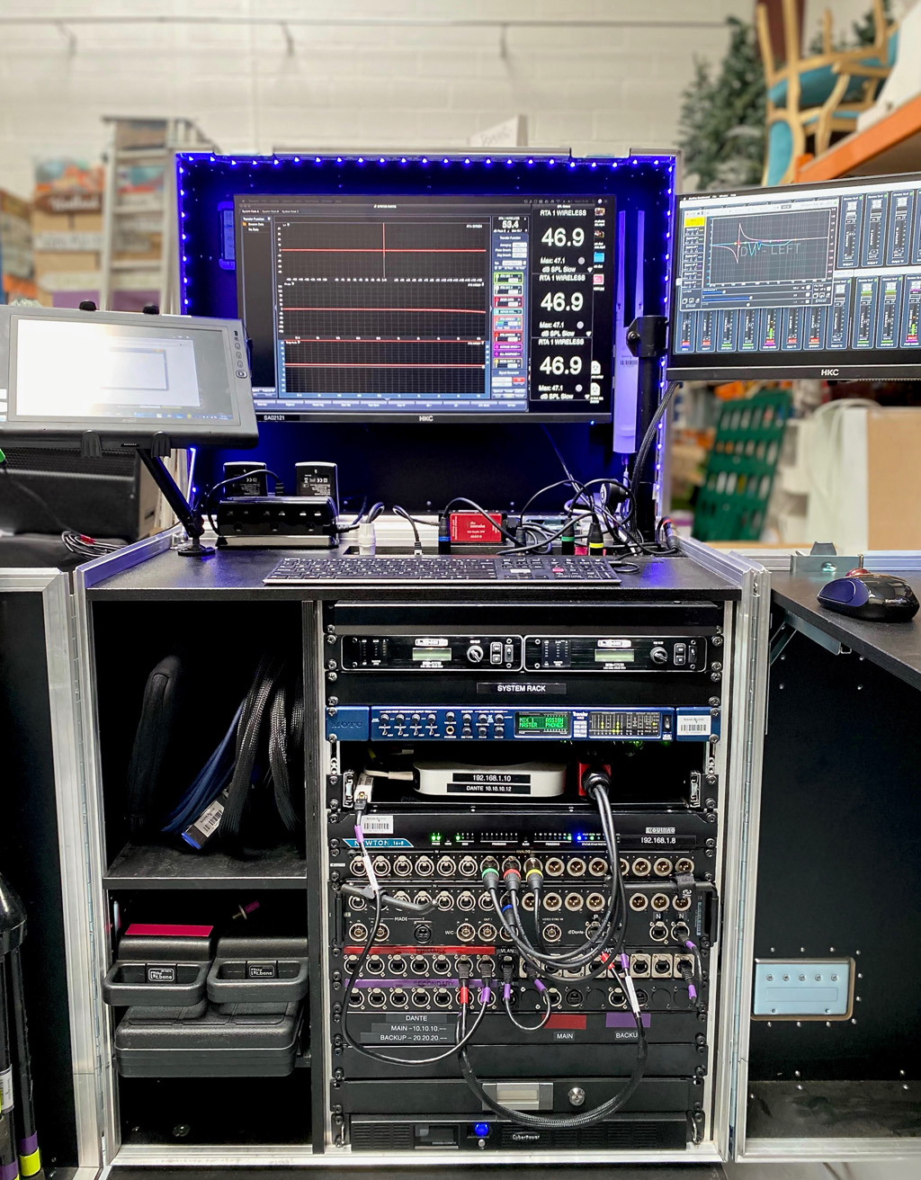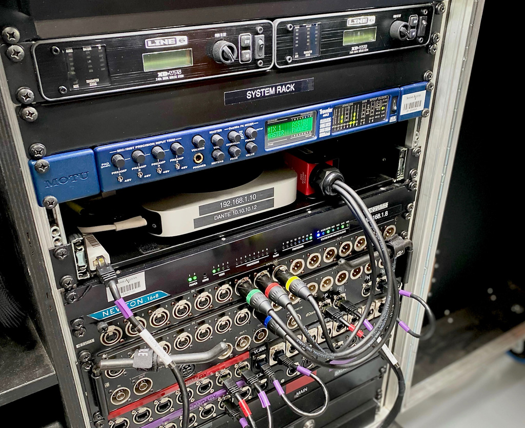 Joe hat ein maßgeschneidertes Laufwerks-Rack um seinen Newton herum gebaut, das drahtlose Geräte für seine RTA- und Timing-Messungen, ein FireWire-Audio-Interface und einen Mac Mini sowie verschiedene Netzwerk-Schnittstellen mit Netzwerk-Switchern enthält. Außerdem hat er eine separate Newton-Stagebox mit einer kompletten Reihe von Ein- und Ausgängen, die für jede Konfiguration geeignet ist.