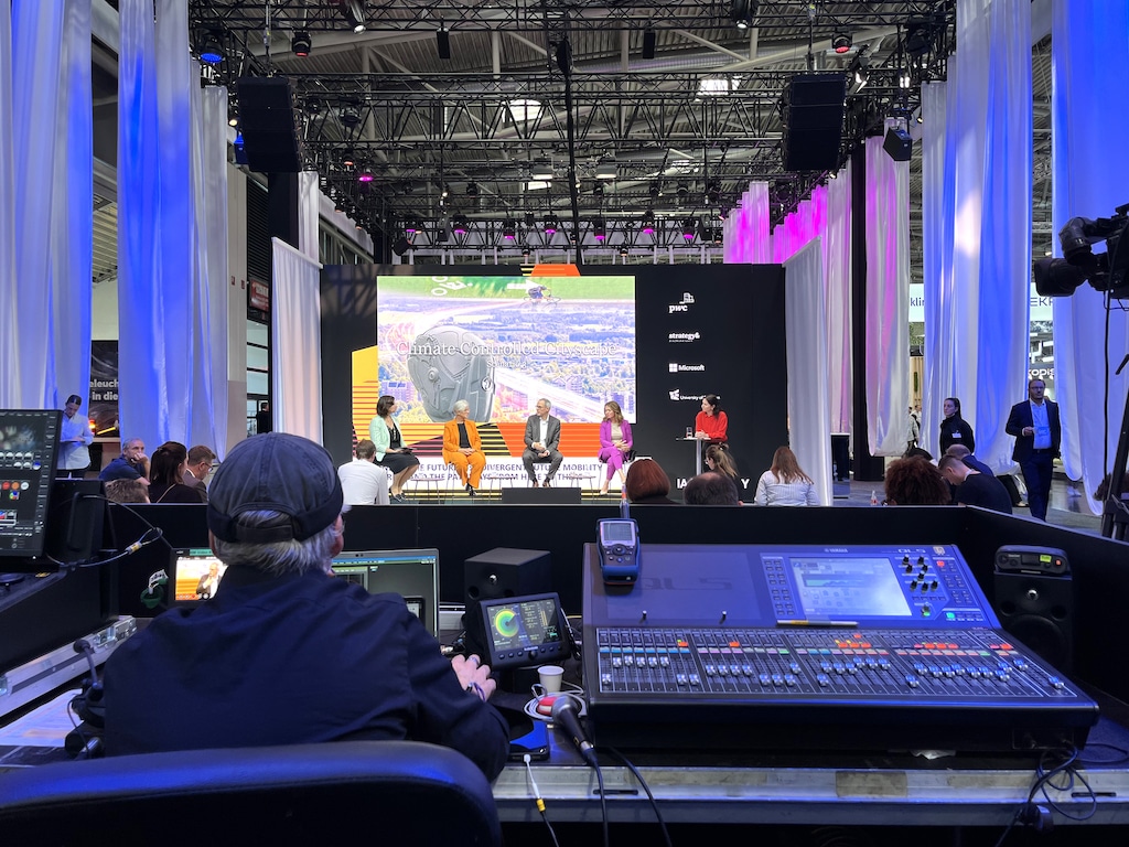 N&M setzt darüber hinaus die technischen Konzepte für die Blue und Yellow Stage, vor denen jeweils 80 bis 100 Gäste die Vorträge der jeweiligen Referent:innen verfolgen, sowie für die Dialogfläche „Visionary Club House“ um. Eine weitere Dialogfläche, die Raum für Kreation und Kollaboration mit 75 Plätzen bietet, ist der „Smart Mobility Space“ von PwC Deutschland und Microsoft, der ebenfalls von N&M realisiert wird. Auf der Bühne gibt es ein umfangreiches Programm mit 25 Themenpanels zu Mobilitätsthemen der Zukunft, von Wasserstoff bis zur Kreislaufwirtschaft und Generativer KI.