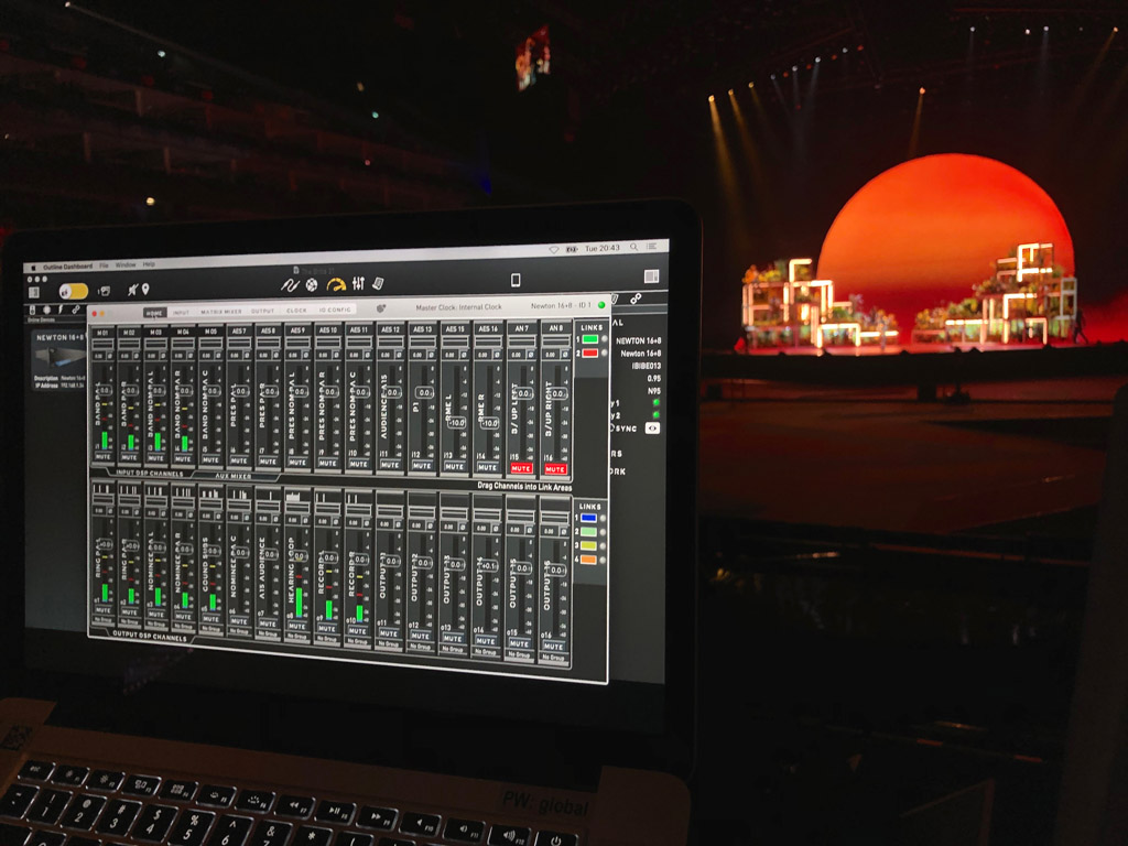 „Der Dante-Ausgang des Newton ergänzte unsere bestehende Dante-Antriebsinfrastruktur, die über Glasfaser zu unserer Verteilung auf dem Dach des O² übertragen wurde. Hier wurde dies in einen AES-Eingang für die Verstärker umgewandelt, von denen die meisten über den PA-Elementen geflogen wurden. Als Back-up diente der optische Madi-Ausgang von Newtons. Auch dieser wurde über Glasfaser zum Dach übertragen, wo er in ein analoges Signal umgewandelt und an die Verstärker verteilt wurde.“
