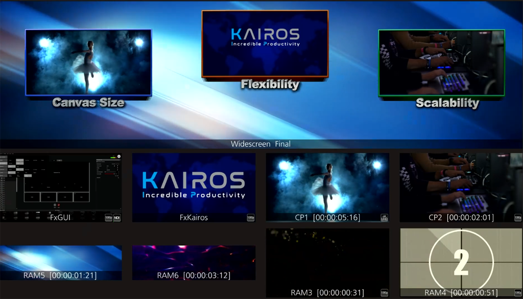 Der neue Kairos Core 1000 Mainframe bietet mehr Rechenleistung dank erhöhter CPU- und GPU-Fähigkeiten. Dadurch könne die Plattform laut Hersteller in einem breiteren und komplexeren Spektrum von Produktionen zum Einsatz kommen. Das Konzept der unbegrenzten Video Layer und die Fähigkeit, verschiedene Szenen gleichzeitig zu verwalten und über eine Vielzahl von Ausgängen auszustrahlen, werden so weiter vorangetrieben.