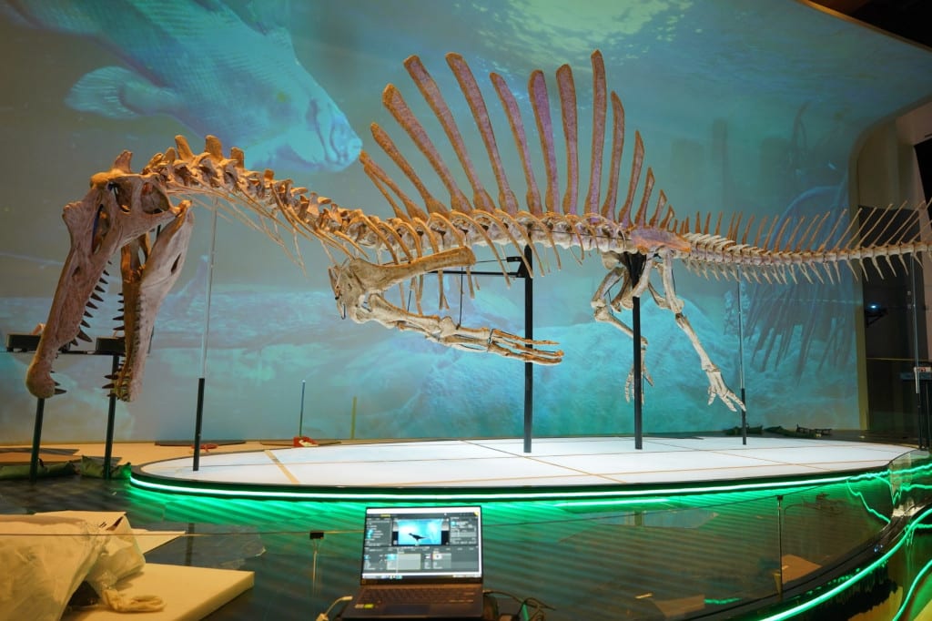 Spinosaurus-Skelett vor belebtem Hintergrund (Bild: Cosmovision)