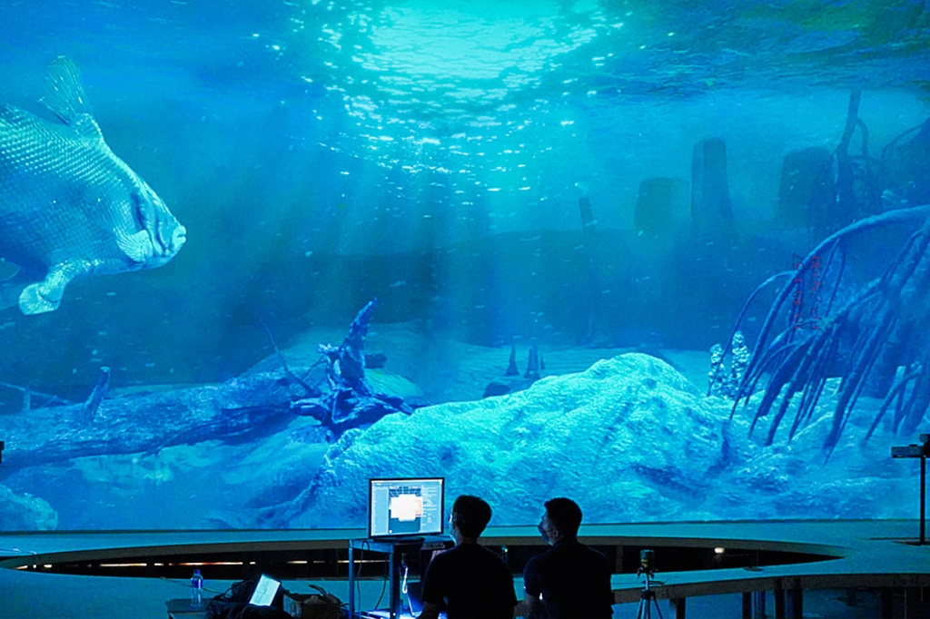 Cosmovisions Technical Sales Engineer Jason Yeung erläutert: „Die 10m x 7m große, wellenförmige Projektionsoberfläche machte eine komplexe Platzierung des Equipments erforderlich. Wir mussten sehr auf sich überlappende Bereiche und Projektionsschatten achten, um das Edgeblending realisieren zu können.” „Es war schwierig, aber mit Pixera und der integrierten Vioso Kamerakalibrierungssoftware konnten wir die Berechnungen leicht automatisch durchführen“, führt er fort.