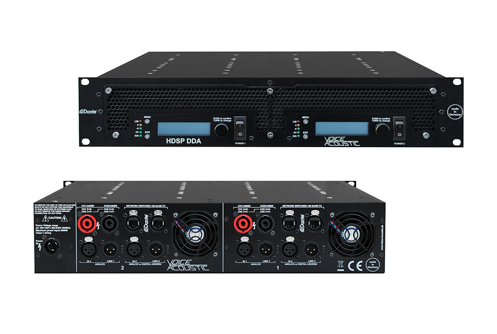 DDA steht für eine neue DSP Generation und Eingangsboards, die eine Vielzahl von Signalen verarbeiten können: Dante, Digital AES/EBU, AES67 und analoge Inputs. Die Signale lassen sich jeweils weiter schleifen. Die Technik kommt in den neuen Systemverstärkern der HDSP-DDA Serie, sowie auch in allen self-powered DDA Lautsprechern zum Einsatz. In den 19″-Rackverstärkern und den self-powered Lautsprechern verbaut Voice-Acoustic identische Leistungs- und DSP-Elektronik, so dass Anwender unterschiedliche Systeme miteinander kombinieren und im Netzwerk über die Remotecontrol Software zusammen verwalten können. Dies bedeutet für die Kompatibilität der Rentalcompanies große Vorteile. Die HDSP-DDA Systemverstärker sind in dual Technology aufgebaut und verfügen durch zwei Netzteile, zwei DSP-Boards und zwei Class-D Sektionen über komplette Redundanz und doppelte Betriebssicherheit. Zudem ist die Elektronik hängend in Upside-Down Bauweise montiert, so dass sich kein Staub auf den Platinen ablegen kann.