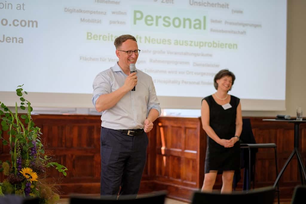 Während der Diskussionsrunde mit Ilona Jarabek, Matthias Schultze und Carsten Müller besprachen die Gäste aktuelle Entwicklungen und Herausforderungen der Veranstaltungsbranche: darunter fehlende Planbarkeit, zunehmender Technikbedarf und Fachkräftemangel. Einigkeit bestand darüber, dass sich die Menschen Live-Events vor Ort wünschen und so freue sich das Jena Convention Bureau zukünftig auf viele Veranstaltungen im neuen Volkshaus.