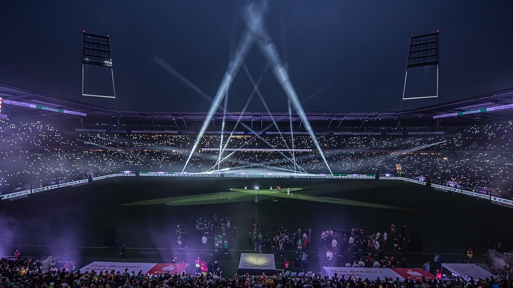 Im Weserstadion setzte Adrian Gediga die Maximus in Vierergruppen ein, die er symmetrisch an den Ecken des Feldes platzierte. Die Excalibur hingegen sorgen zusätzlich in zwei Sechsergruppen rechts und links der Hauptgeraden für eindrucksvolle Lichtbilder. „Für mich war es sehr wichtig, nur IP-Geräte im Stadion einzusetzen. Beide Modelle haben mich mit ihrem hohen Lichtoutput in dieser Anwendung voll überzeugt. Speziell der Lichtaustritt aus der 260mm-Linse des Excalibur war in den Dimensionen des Stadions einfach top.“