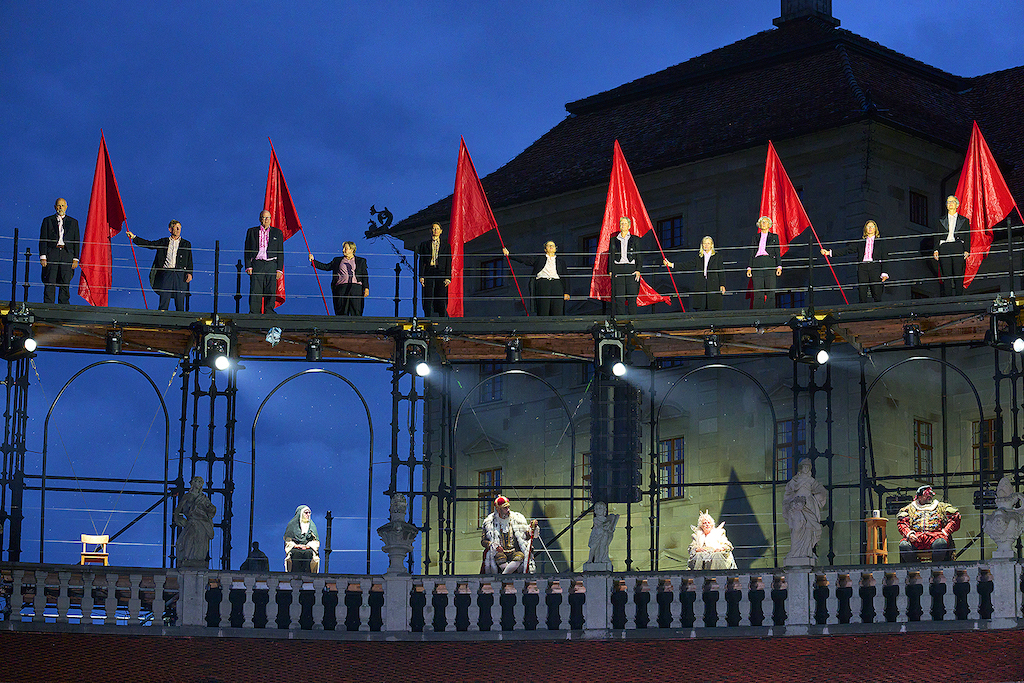 Die Bühne und die Kostüme wurden von AnnaMaria Gaudemans entworfen. „Vor der imposanten Klosterfassade befand sich eine über 3500 m² stark abfallende Spielfläche, aufgeteilt in Vorplatz, Treppenanlage und offenen Hauptplatz. Dieser publikumsnahe Hauptplatz war umsäumt von zwei geschwungenen seitlichen Arkaden, welche durch eine, der Architektur folgenden, bespielten filigranen „Gerüstbau-Galerie“ überhöht wurde; dadurch entstand durch die begrenzende Anordnung von zwei Viertelrunden Tribünen trotz der großen Distanzen eine intime Nähe zum Geschehen“, erläutert Rolf Derrer.