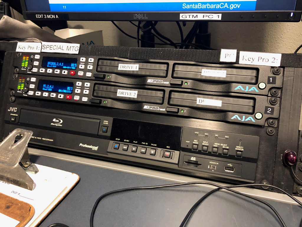 Sie streamen und zeichnen alle Stadtratssitzungen und andere Sendungen auf YouTube auf. Der YouTube-Link ist auf der Website der Stadt Santa Barbara eingebettet, so dass die Zuschauer nach Belieben live oder auf Abruf zuschalten können. Die vor Ort produzierten Inhalte werden in der Regel mit 12 HD-Kameras aufgezeichnet, die auf drei Sitzungsräume verteilt und über Glasfaser- und Cat5e-Kabel mit einem Hauptkontrollraum verbunden sind. Die Audio- und Video-Feeds werden aus jedem Raum über einen Produktionsmischer gesendet, um den Haupt-Feed zu erstellen, der dann über einen Router an eines der drei AJA HELO H.264-Streaming-Geräte gesendet wird, die sich in einem Geräteraum für das Live-Streaming auf YouTube befinden.