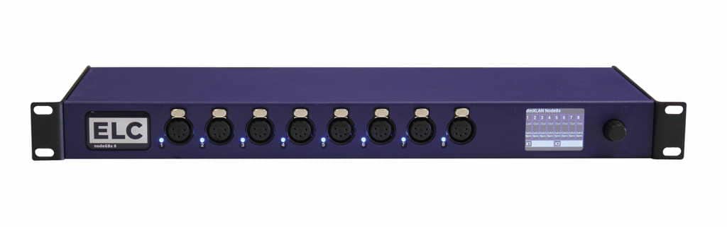Der ELC dmXLAN nodeGBx8 ist ein DMX/Ethernet-Knoten mit integriertem Dual-GBit-Switch (10/100/1000) und Farbdisplay. Mit dem Gerät lassen sich DMX-Daten splitten, mergen und softpatchen. Es bietet auf der Frontseite acht bidirektionale 5pol XLR female Anschlüsse (optisch isoliert), die als DMX-Ausgänge, DMX-Eingänge oder DMX-Ausgänge mit RDM genutzt werden können. Zwei Gigabit-Ethercon-Anschlüsse befinden sich auf der Rückseite.