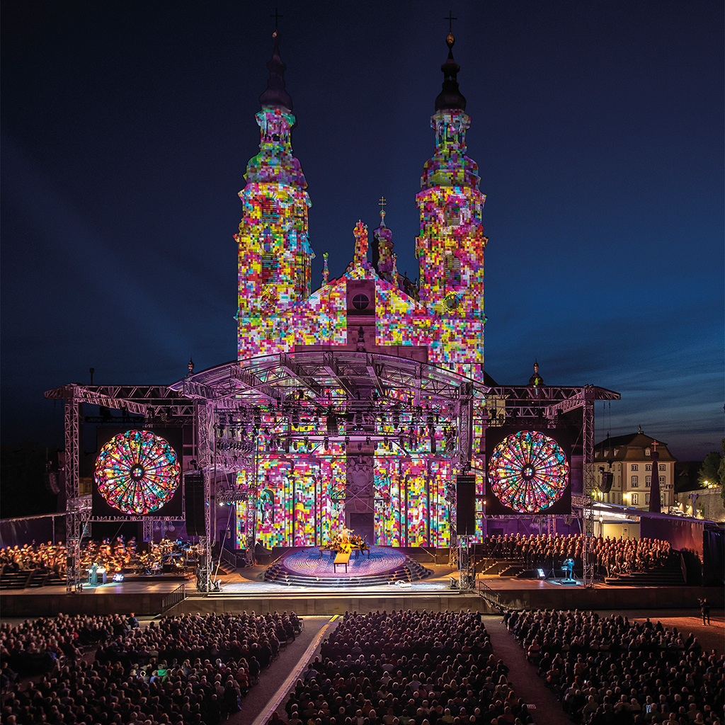Isabel Winkelmann-Grm und Björn Kowalzig waren Projektleiter im Auftrag von satis&fy und, so Dipl.-Ing./M.Sc. Interior Architect Isabel Winkelmann-Grm, von Beginn an in das Projekt involviert: „Das Stadtmarketing ist vor rund zwei Jahren an uns herangetreten, und von Anfang an stand fest, dass anlässlich des Jubiläums ein großformatiger Auftritt mit hohem Qualitätsanspruch und einem markanten Look gefragt war, der sich als Marke etablieren lässt.“ Dass es sich hierbei keineswegs um einfache Routine, sondern um eine große Herausforderung handelte, die es zu meistern galt, erklärt Senior Technical Director Björn Kowalzig: „Anlässlich der alljährlich anberaumten Domplatzkonzerte wurden in der Vergangenheit zwar schon öfter Bühnen vor dem Dom errichtet, die jedoch nie das Format des 2019 zum Einsatz kommenden Aufbaus erreichten – insofern konnten wir für das Jubiläumsvorhaben mit Ausnahme weniger Einzelaspekte nicht auf Erfahrungswerte zurückgreifen.“