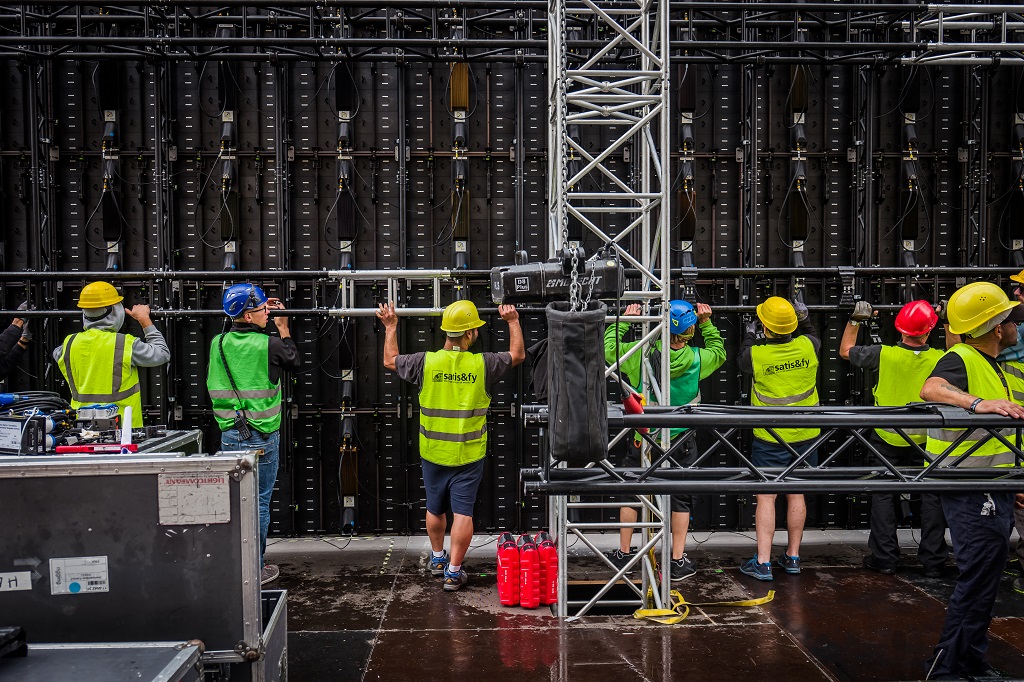 Zwei Transformatorenstationen waren das Fundament für die von satis&fy auf dem 6.790 m2 großen Gelände eingerichtete Stromversorgung. Damit war bereits vor dem Event sowohl bei die Proben, den Vorbereitungen als auch dem Aufbau für eine lückenlose und zuverlässige Energiequelle gesorgt. Auch eventuelle Notfälle wurden bedacht und einkalkuliert, so hätten akkugepufferte LED-Leuchten, die sich am FOH-Tower sowie am Bühnenportal befanden, bei einem Stromausfall für eine reibungslose Überbrückung bis zur erneuten Inbetriebnahme der an neuralgischen Punkten aufgestellten Lichtmasten garantiert. Bei einem Worst Case Scenario wären die Lichtmasten via Generatoren versorgt worden. LED-Wände informierten die Gäste bereits im Vorfeld nicht nur über korrektes Verhalten in Notfallsituationen, sondern auch über Außerplanmäßigkeiten das Programm betreffend. Als der Aufführungsbeginn an einem der Musical-Abende aufgrund von starkem Regen um eine Stunde verschoben werden musste, waren die Gäste dank der gut lesbaren LED-Screens rechtzeitig in Kenntnis gesetzt.