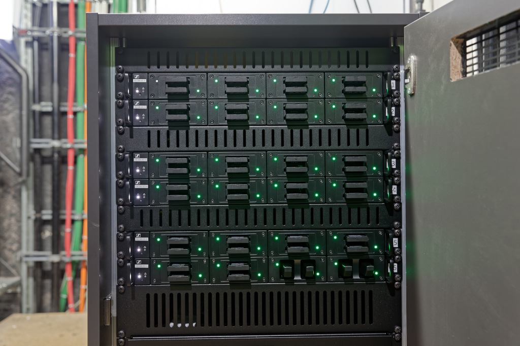 Zum Betrieb von Hand- und Taschensendern werden im Gärtnerplatztheater Sennheiser-Lithium-Ionen-Akkupacks der Typen BA 60 und BA 62 verwendet. Die entsprechende Lade-Infrastruktur gruppiert sich um sechs Ladestationen L 6000 mit 22 Lademodulen LM 6062 für Taschensender-Akkkus und vier Lademodulen LM 6060 für Handsender-Akkus. Dirk Buttgereit: „Die Ladestationen sind ins Netzwerk eingebunden, so dass sich die Kapazitäten der eingesetzten Akkus aus der Ferne überwachen lassen. Die Laufzeit von bis zu 13 Stunden ist überragend und für einen normalen Arbeitstag bei uns im Haus mehr als ausreichend. Auf die Anzeige der Restlaufzeit in Stunden und Minuten kann man sich bedenkenlos verlassen.“