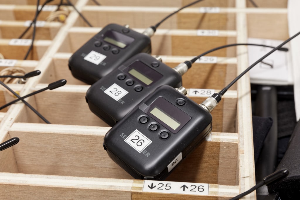 Vor Aufführungen werden die Sennheiser-Taschensender samt Mikrofonen an einem mobilen Arbeitsplatz an die Bühnenakteure ausgegeben. Die Servicestation befindet sich auf einem Gang nahe des Zugangsbereichs zur Bühne und beinhaltet neben Taschensendern, Headsets und Mikrofonen auch Zubehör bis hin zu diversen Pflastern, die zur Befestigung der Mikros auf der Haut benötigt werden. Die verantwortlichen Tontechniker:innen können relevante Parameter der Drahtlosverbindungen mithilfe der auf einem Laptop installierten WSM-Software im Blick behalten.