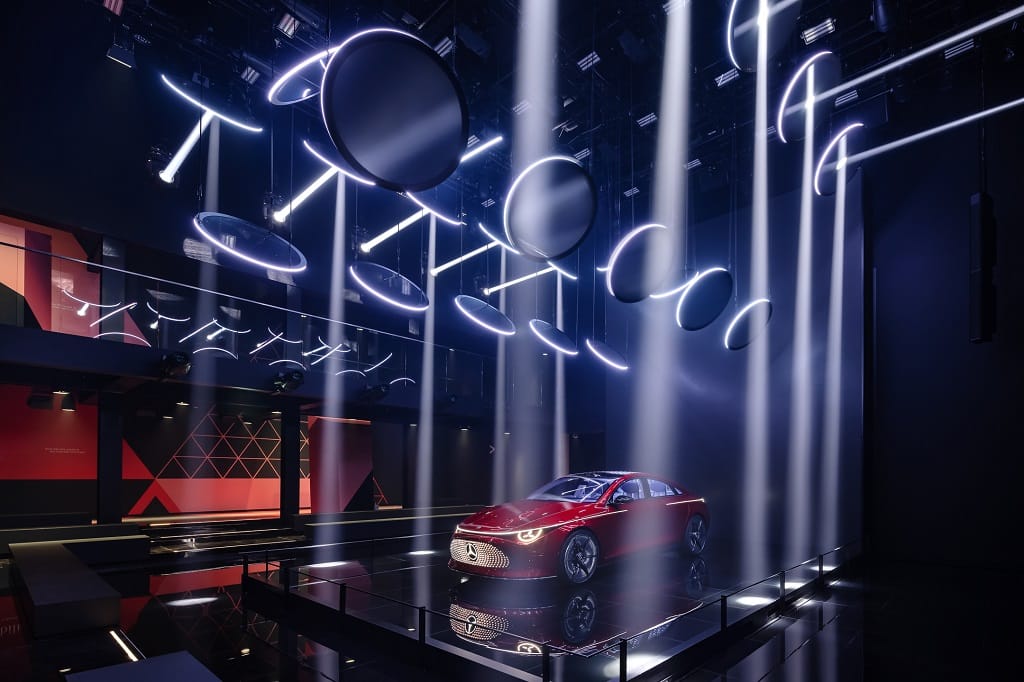 Die Inszenierung des Highlight-Fahrzeuges im Mercedes-Benz Open Space Kubus sei ein Besuchermagnet des diesjährigen IAA gewesen. Es stand inmitten eines temporären Kubus auf und vor einer LED-Wand. Über dem Auto schwebten runde Spiegel an kinetischen Winden. In einer Gesamtinszenierung mit Musik, Video, verfahrbaren Spiegel und Licht wurde es in Szene gesetzt, während die Besucher:innen durch den zweistöckigen Kubus laufen und sich über das neue Fahrzeug und die Marke Mercedes informieren konnten.