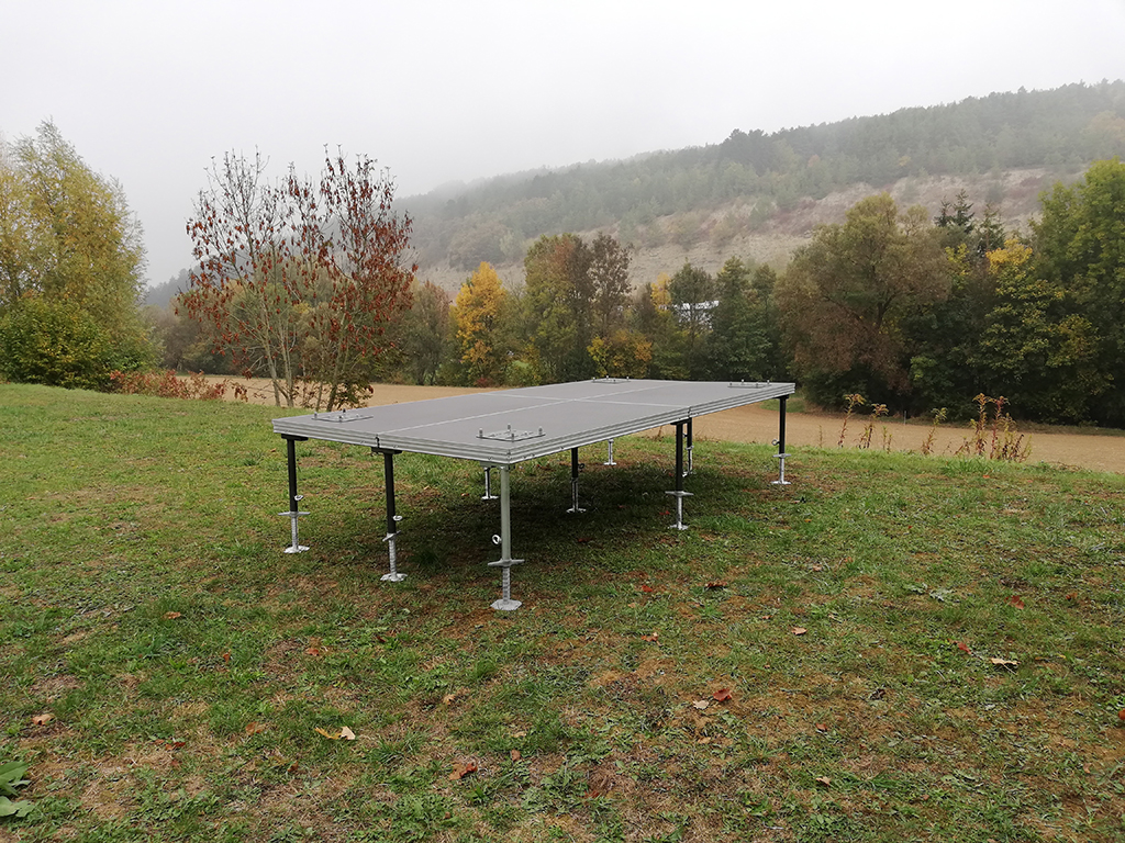 Um die Aufbauzeiten mobiler Bühnenpodeste weiter zu minimieren wurde gemeinsam eine effektive Kombination von Podest und Traversenaufbau entwickelt. Ab sofort wird die Podestserie Praktikus 750 mit einer integrierten Vorrichtung für den Traversenaufbau angeboten. So kann der Groundsupport werkzeuglos direkt auf das Bühnenpodest verbunden werden. Ferner lässt sich diese Anbindung verdrehen und kann auch horizontal in bestimmte Grenzen an die benötigte Position angepasst werden.