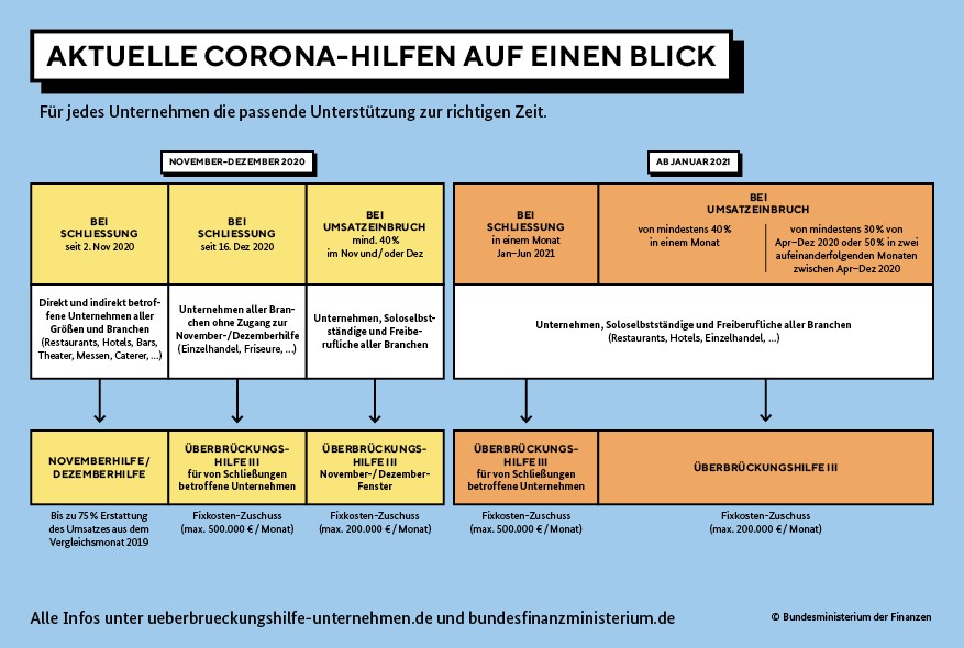 Um Unternehmen, Selbstständige und Freiberufler zu unterstützen, die in der Corona-Pandemie von Schließungen und massiven Umsatzrückgängen betroffen sind, hat das Bundesfinanzministerium zusammen mit dem Bundeswirtschaftsministerium die Palette der zur Verfügung stehenden Wirtschaftshilfen ausgeweitet.