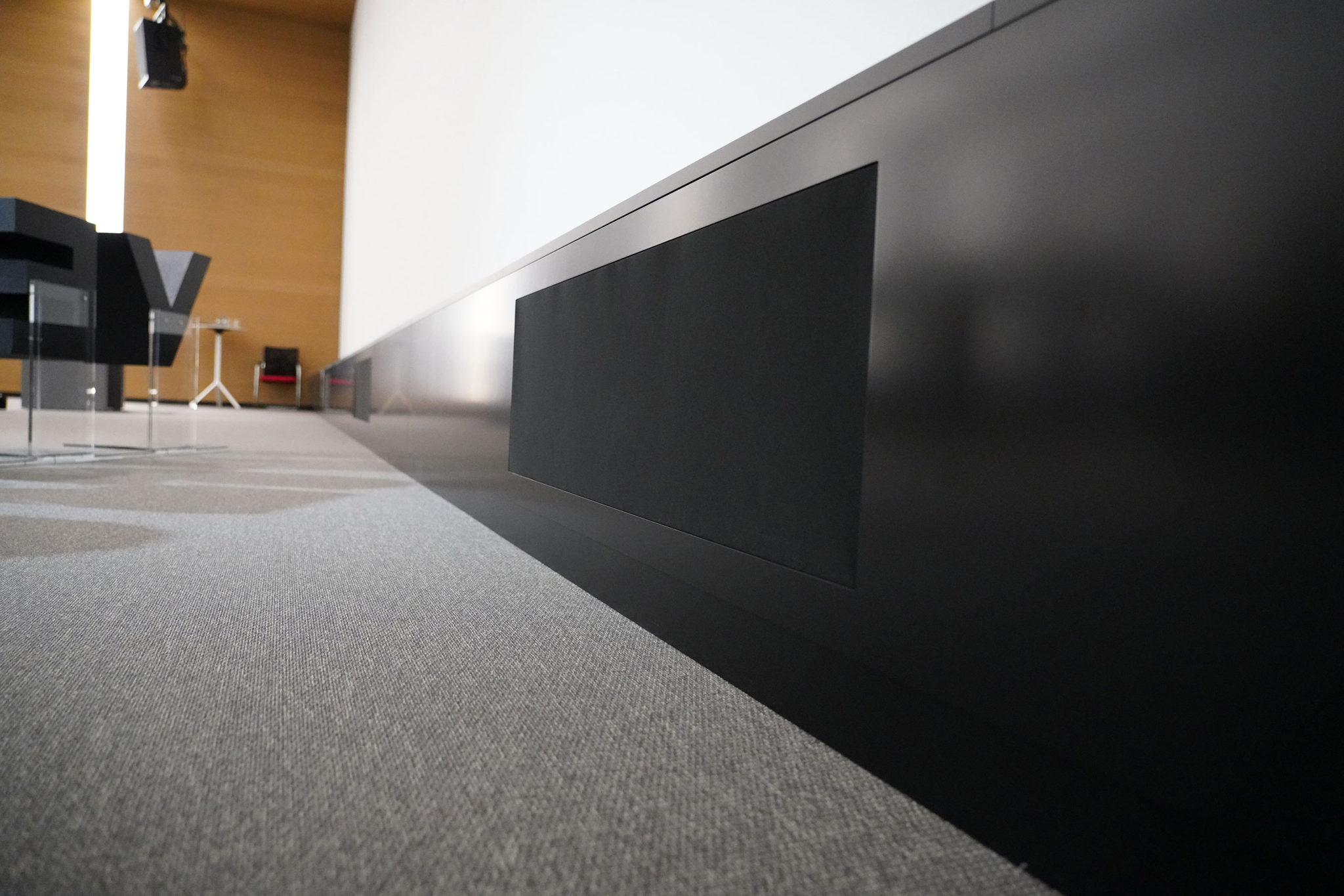 Die Installation der Subwoofer sollte möglichst unkompliziert sein, aber auf keinen Fall die Ästhetik des Auditoriums beeinträchtigen. Die gefundene Lösung ist von bestechender Eleganz: Die vier USW-210P Compact Narrow Subwoofer wurden in einem maßgefertigten mattschwarzen Sideboard verbaut, das sich über die gesamte Stirnwand des Auditoriums zieht und sich harmonisch in den Raum integriert.