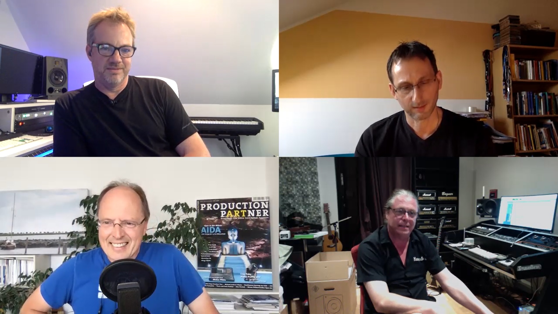 Hammerfall-Talk von links oben im Uhrzeiger- sinn: Frans Ebbesson (System-Tech), Michael Spiess (FOH), Pontus Norgren (Git.) und Detlef Hoepfner