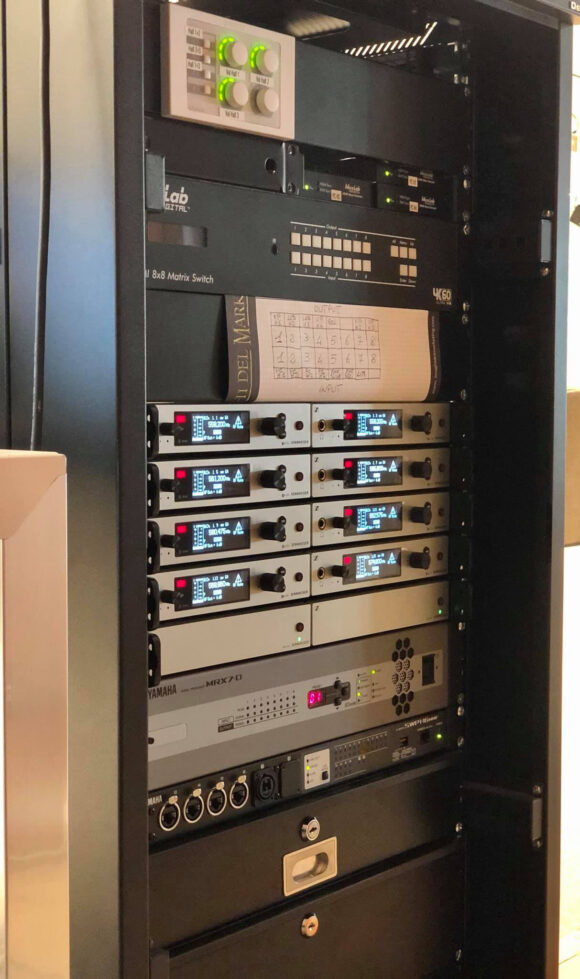 Das System wird von einem MRX7-D-Matrixprozessor gesteuert, mit einem SWP1-16MMF L2-Switch für das Dante-Routing. Acht drahtlose Mikrofone sind für die Kongress-Lautsprecher vorgesehen, während ein drahtloser Streaming-Verstärker Music Cast WXC-50 vielseitige Hintergrundmusik- und Abspielmöglichkeiten bietet.