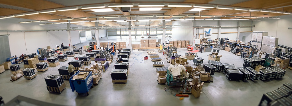 Irgendwann kamen Movinglight-Hersteller auf Amptown zu und fragten hohe Stückzahlen der SiP-Einsätze samt Flightcase an. Martin Professional waren die Ersten, die diese optimale Transportlösung als Verkaufsargument erkannten. Bereits in den 90iger Jahren hatte man Dimmer-Racks für MA oder für Pioneer DJ-Equipment stilecht verpackt. Inzwischen gehören einige namhafte Hersteller zu den ständigen Großabnehmern: GLP erhält exklusive Cases, ebenso JB-Lighting. Erst kürzlich kam auch Clay Paky hinzu. Für viele dieser Hersteller werden große Stückzahlen auf Lager gehalten. Platz genug dafür ist in Seevetal – noch.